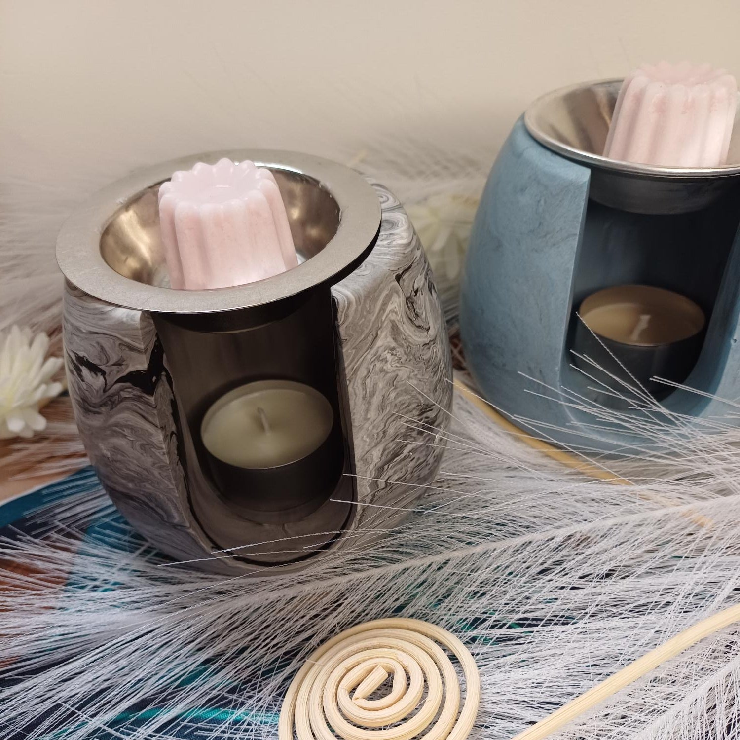 Diffuseur fourni avec une coupelle, 2 bougies chauffe-plat et une petite boite de fondant.